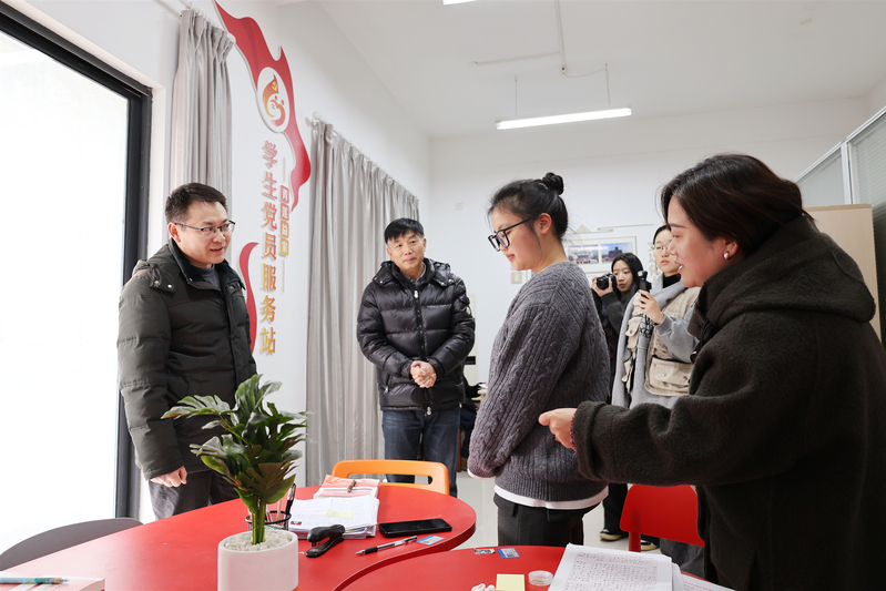 随后,校领导一行实地走访了学生社区活动阵地。在学生党员服务站,史习明详细了解了学生党员的发展流程、支部党建工作的开展特色,并就服务站未来的功能优化与发展规划同现场负责人进行了探讨。在公寓大厅,史习明关切地询问了寝室楼管员关于学生晚归登记、宿舍安全管理等方面的工作落实情况,叮嘱要守好宿舍安全底线,营造温馨和谐的生活环境。在学生活动中心,张启富询问了学生的学习与工作情况,与现场负责人深入交流“活动育人”相关工作,强调要进一步丰富活动载体,提升育人实效。
