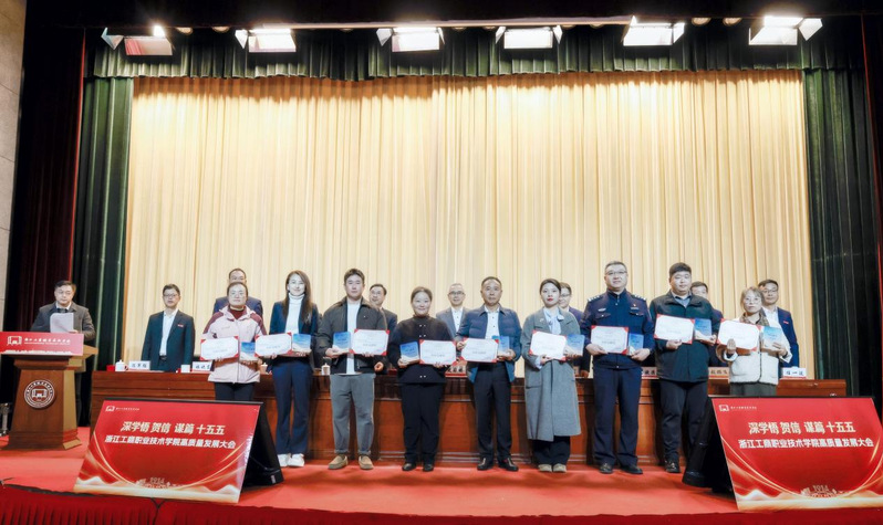 为进一步贯彻落实党的二十届四中全会精神,科学谋划学校“十五五”发展,根据“学贺信、建双高、创强校”高质量发展专题大讨论系列活动部署,学校于1月16日下午召开了以“深学悟‘贺信’ 谋篇‘十五五’”为主题的高质量发展大会。全体校领导和全体教职工参会,会议还特别邀请了10位为我校教育事业作出突出贡献的各界合作伙伴代表参加,他们中有合作企业、社会组织、工业园区负责人、社区民警的代表。会议由党委副书记俞位增主持。