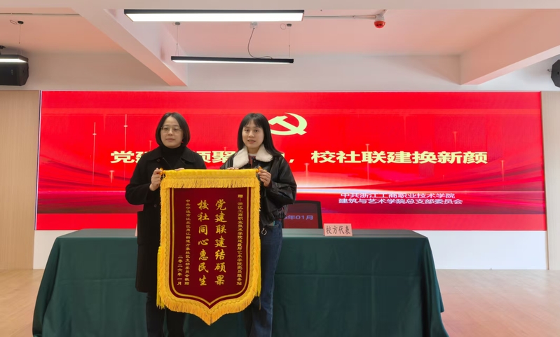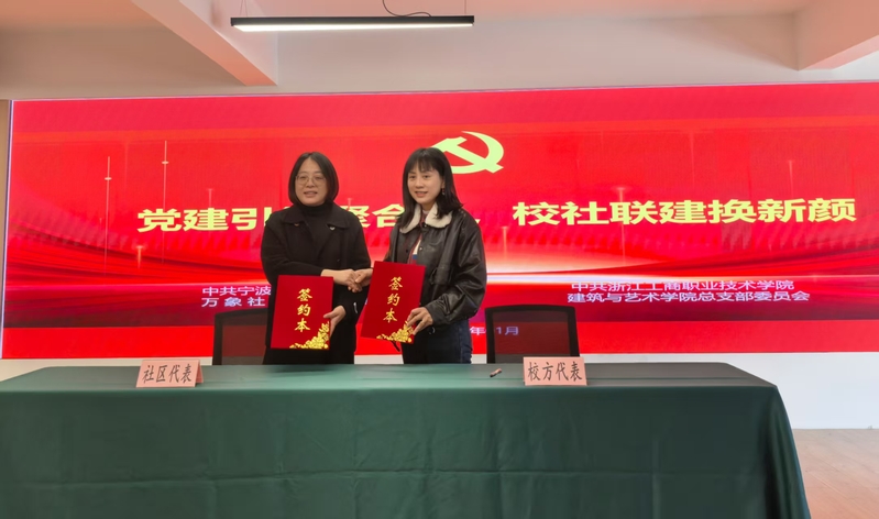 为推动项目落地,1月13日,浙江工商职业技术学院建筑与艺术学院与万象社区举行“党建联建、校地共建”签约暨揭牌仪式。仪式上,双方代表共同揭牌,万象社区党支部书记茅幼丹向学院学生党员服务站授旗,旗上印有“党建联建结硕果,校社同心惠民生”字样,表达对学院师生志愿服务的高度认可与未来合作的期待。随后,浙江工商职业技术学院AI云媒体微学院、文旅设计学生社区支部分别与社区签署专项合作协议,标志着校地合作进入新阶段。